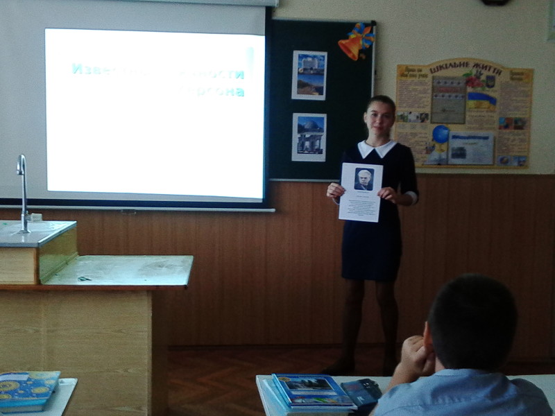 До дня міста учні 7-Б класу підготували проекти  на тему «Видатні постаті Херсонщини». Були згадані відомий актор Сергій Гармаш, режисер Сергій Бондарчук, український маляр-аквареліст Олексій Шовкуненко, дев’ятиразова олімпійська чемпіонка зі спортивної гімнастики Лариса Латиніна та інші відомі люди нашого міста.