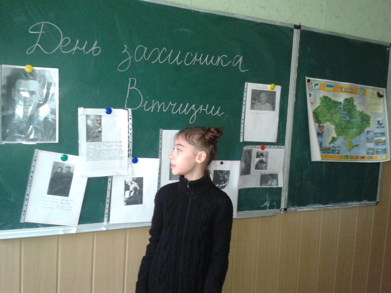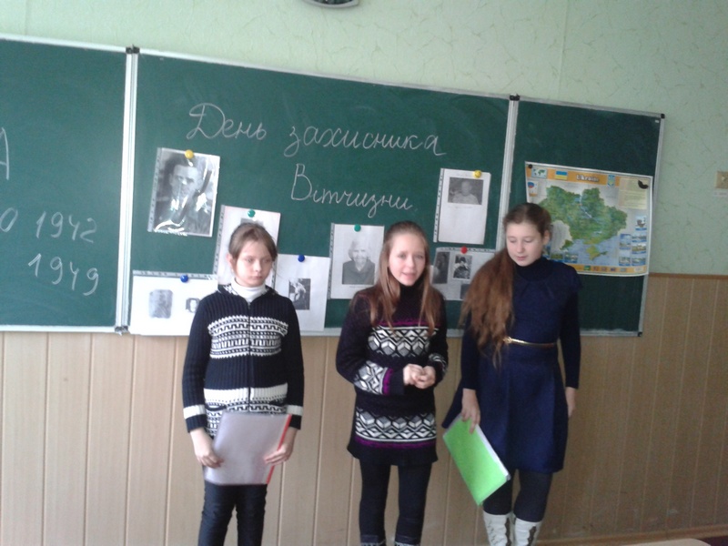 12 жовтня у 6-В класі пройшла година спілкування “Мужність і відвага крізь покоління”, присвячена Дню захисника України. Метою заходу було формувати мотивацію, спрямовану на підготовку до захисту держави і служби у Збройних Силах України, виховати українську молодь в дусі військових традицій Українського народу, формувати патріотично зрілу особистість. Діти глибоко пройнялися шанобливим ставленням до таких понять, як військова честь, звитяга, мужність, захист кордонів і рідної землі, побратимство. Цей захід залишив глибокий слід в душах учнів.