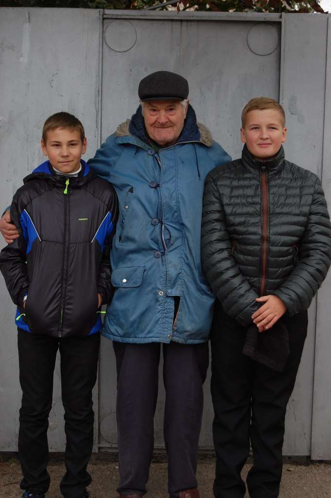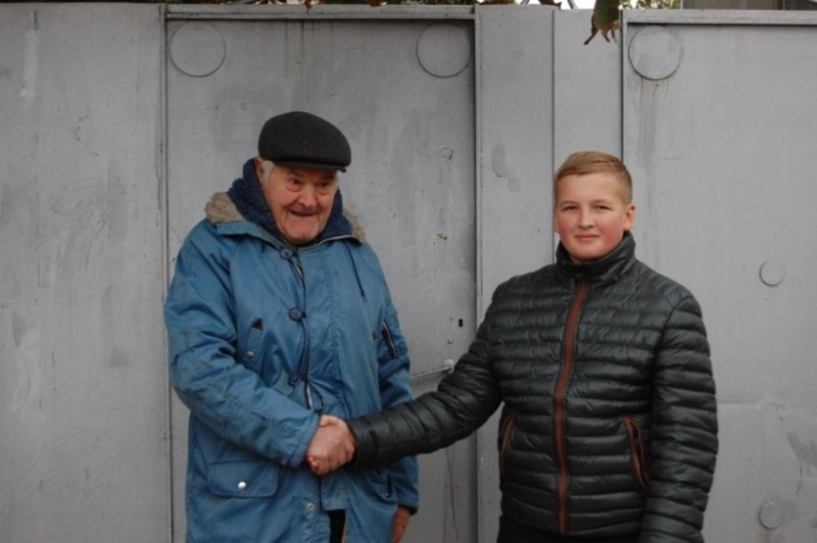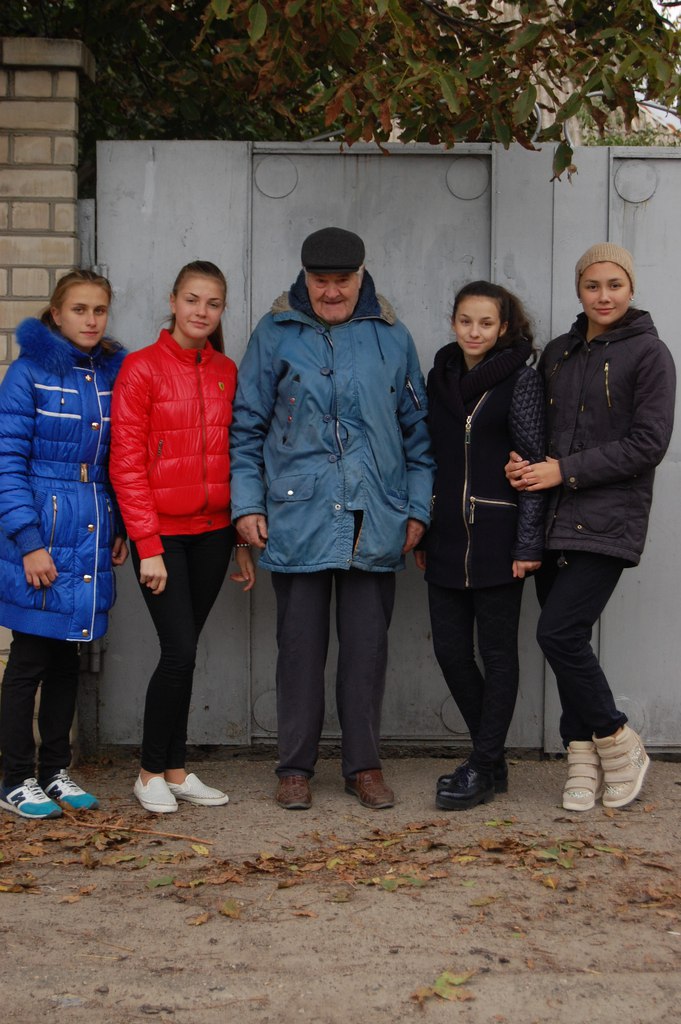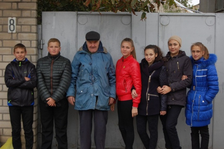 9-А клас привітав зі святом Дня захисника України ветерана війни Коваля Григорія Ігнатовича. Григорій Ігнатович розповів дітям про своє життя, як він пережив війну. В 40-х роках йому було 18 років, працював на елеваторі. Коли Григорій Ігнатович збиравсяйти у відпустку, почалася війна. Від Цюрупинська до Курска, він, його товариши та ще сотня людей, йшли пішки, але не всі дійшли. В армії він став шофером. Коли він знаходився на службі між Курском і Старим Осколом, попав під обстріл, був вимушений відступати, і його узяли у полон німці. Примусово працював механіком, а через деякий час йому вдалося втекти. Григорій Ігнатович повернувся додому, у Первомайськ, де його одразу ж забрали в разведшколу. Виконуючи важливе завдання уряду, був тяжко поранений. На лікування відправили у Херсонський шпиталь. Після одужання Григорій Ігнатович став пілотом. Но в подальшому житті це йому не знадобилося, так як війна вже закінчилась. Григорій Ігнатович залишився жити в Херсоні.