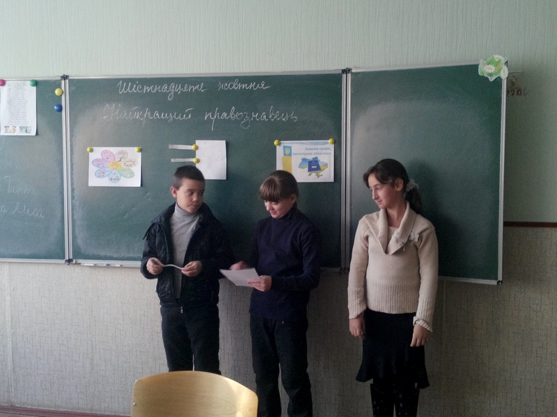 16 жовтня у 5-Б класі проведена бесіда на тему “Знай свої права” з метою сприяння розвитку правової культури п’ятикласників, формування громадянської позиції, виховання почуття патріотизму, поваги до рідних, однокласників, учителів.. Однією з форм роботи під час заняття була гра “Казкова правова вікторина”, під час якої діти, розподілившись на команди, вчились швидко аналізувати проблему та ухвалювати рішення. Учням портрібно було на прикладі героїв відомих казок роз’яснити статті Конвенції про права дитини. Слід зазначити, що усі команди впорались із завданням.