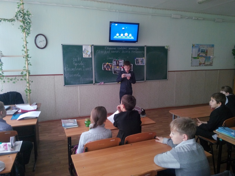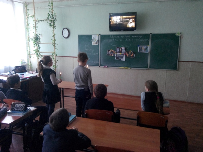 Усе далі йдуть у минуле жахливі роки голодоморів. Цинічний злочин, скоєний більшовицькою владою за сталінського режиму – не єдина спроба позбавити українську національну спільноту права на існування, проте чи не найжахливіша. Про ці страшні роки й мільйони невинних жертв під час уроку пам’яті до Дня пам’яті жертв голодоморів “Запали свічку”  дізналися учні 5-Б класу. Діти дізнавалися про причини та наслідки страшного геноциду, слухали поетичні твори та дивились уривки відеохроніки страшних часів і були вражені жахливою правдою. З болем та скорботою за мільйонами загиблих українців минула хвилина мовчання.