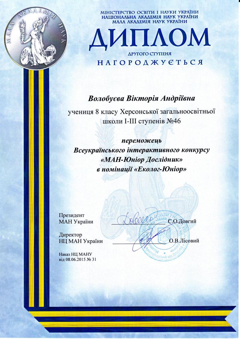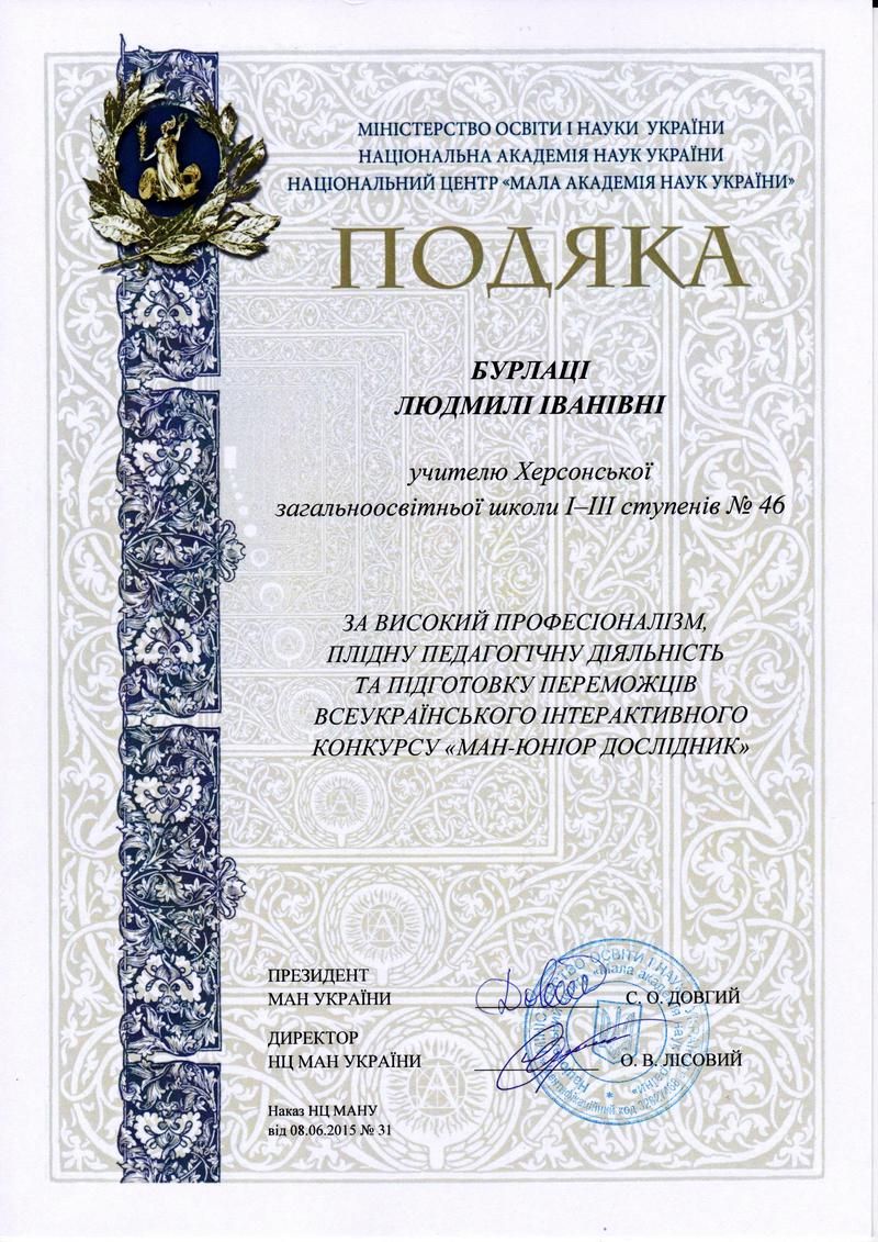9-В класу з перемогою (ІІ місце) у Всеукраїнському інтелектуальному конкурсі «МАН – Юніор дослідник у номінації «Еколог – Юніор» та Бурлаку Людмилу Іванівну з нагородою за високий професіоналізм, плідну педагогічну діяльність та підготовку переможця Всеукраїнського інтелектуального конкурсу «МАН – Юніор дослідник»
