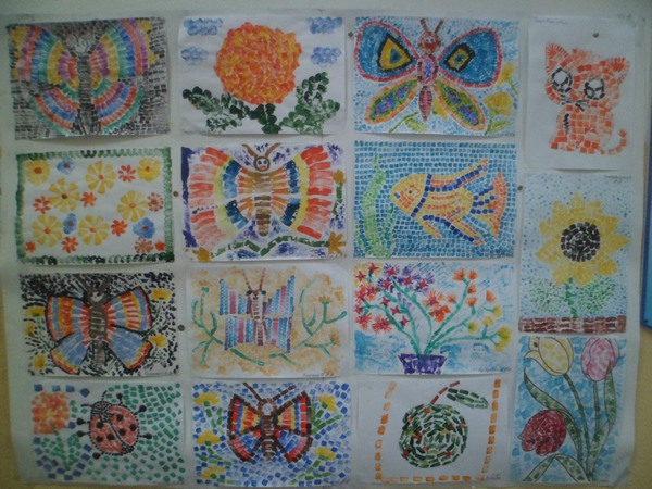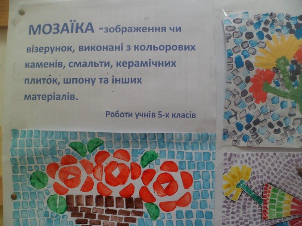 Протягом тижня в фойє початкової школи проходила виставка робіт учнів 5-х класів «Кольорова мозаїка». Діти познайомилися з цікавою технікою виконання мозаїки за допомогою штампів та фарб. Бажаємо творчих успіхів учням 5-х класів.